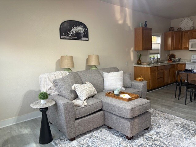 Discover comfortable living at 2305 6th Street, Bremerton. This welcoming ground floor 1-bedroom, 1-bathroom unit is part of an intimate 4-plex and boasts several attractive features. The open-floor plan ensures the space is airy and bright, complemented by gray LVP flooring that adds a modern touch. The kitchen is equipped with oak cabinetry and white appliances, creating a charmingly timeless aesthetic. White Levolor blinds adorn the windows throughout the unit, contributing to a neat and cohesive look. Storage will never be an issue with several closets located in the hallway. Plus, there's a shared washer and dryer in the basement for your convenience. The monthly rental with a $100 fee that covers water, sewer, and garbage services. Step into easy living at this delightful Bremerton property.